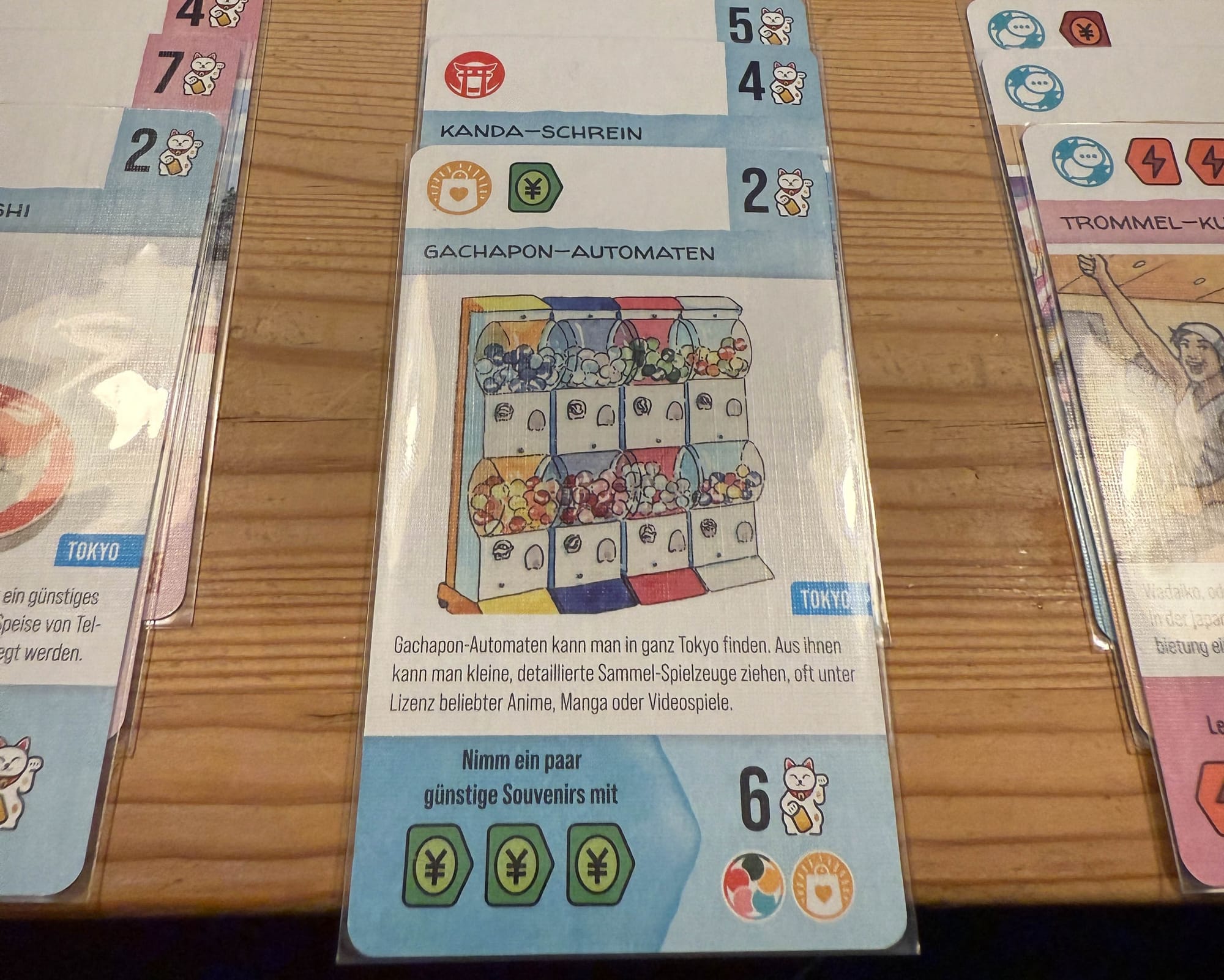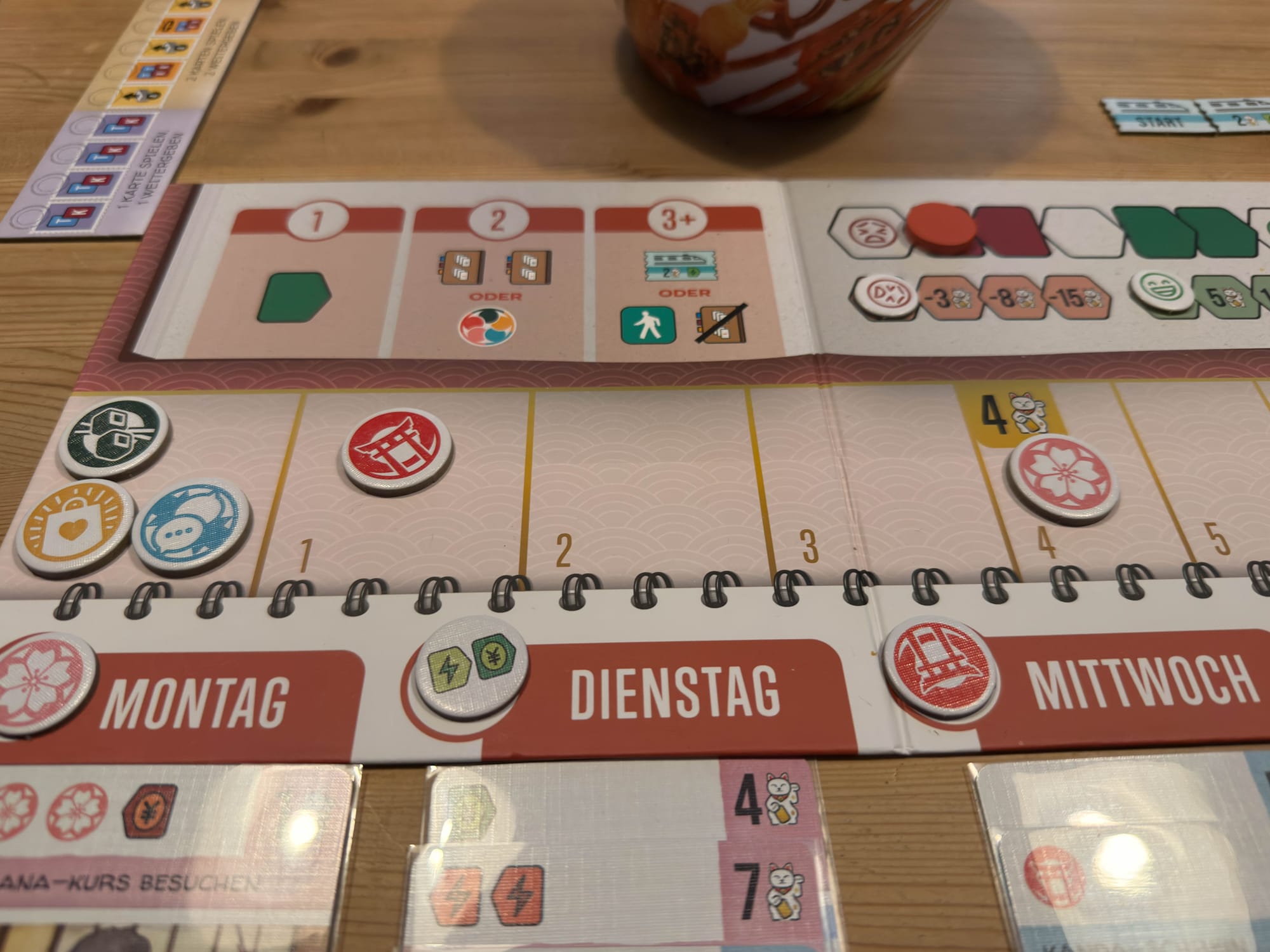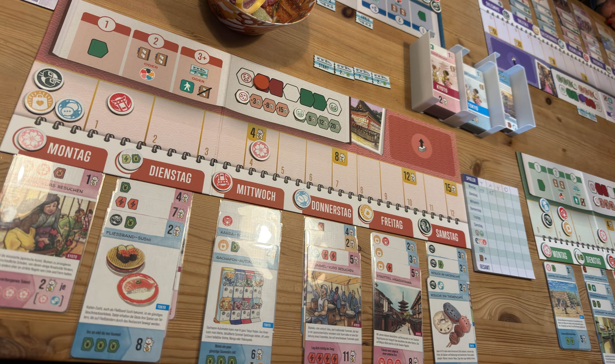 Die zwei Städtestapel für Tokio und Kyoto, der Wochenkalender als Tableau sowie die Tagesmarker bilden das Herz der Ausstattung. Dazu kommen Zugtickets, Marker für Stimmung und Erfahrung, Forschungstoken, Planerplättchen und Joker. Alles greift sauber ineinander, die Rundenleiste zeigt klar, was in welcher Runde zu ziehen und auszuspielen ist. Die Karten bieten viel Text und Iconfläche, ohne zu überladen.